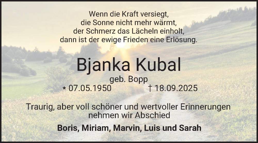 Hier finden Sie alle Traueranzeigen aus der Zeitung, die bisher für Bjanka Kubal erschienen sind. Weitere Traueranzeigen, die in der Zeitung erscheinen, werden hier ebenfalls aufgelistet