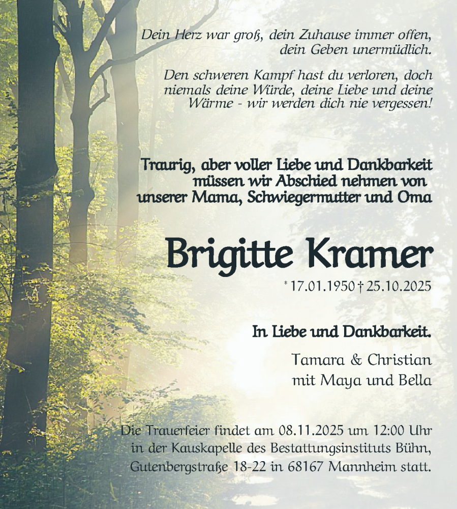 Hier finden Sie alle Traueranzeigen aus der Zeitung, die bisher für Brigitte Kramer erschienen sind. Weitere Traueranzeigen, die in der Zeitung erscheinen, werden hier ebenfalls aufgelistet
