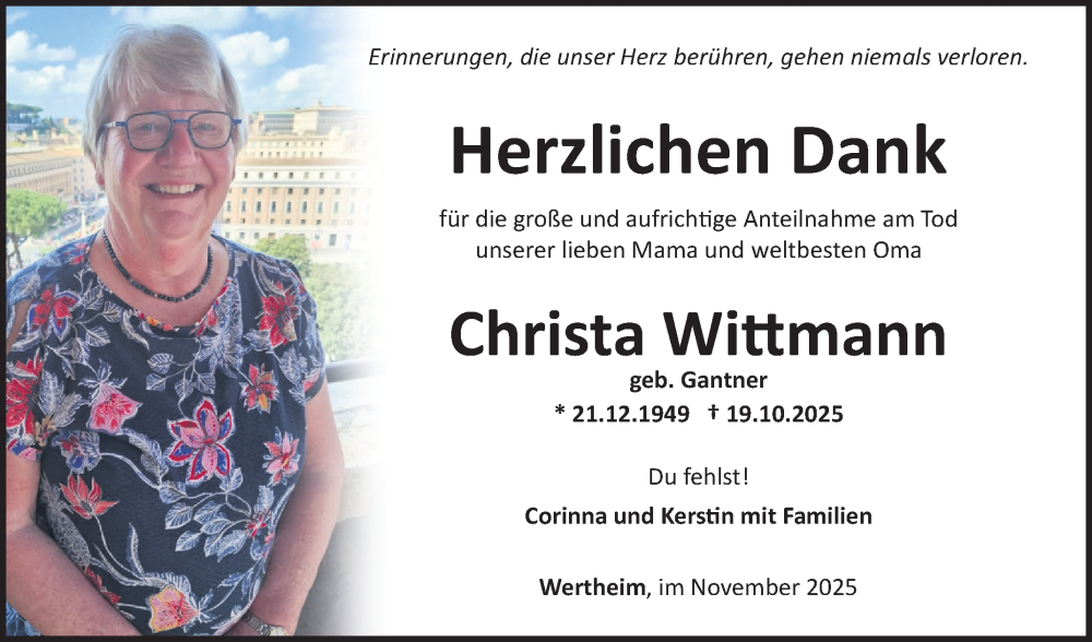 Hier finden Sie alle Traueranzeigen aus der Zeitung, die bisher für Christa Wittmann erschienen sind. Weitere Traueranzeigen, die in der Zeitung erscheinen, werden hier ebenfalls aufgelistet