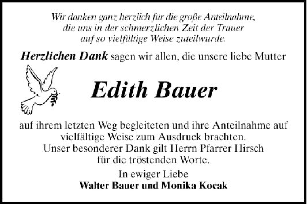 Hier finden Sie alle Traueranzeigen aus der Zeitung, die bisher für Edith Bauer erschienen sind. Weitere Traueranzeigen, die in der Zeitung erscheinen, werden hier ebenfalls aufgelistet