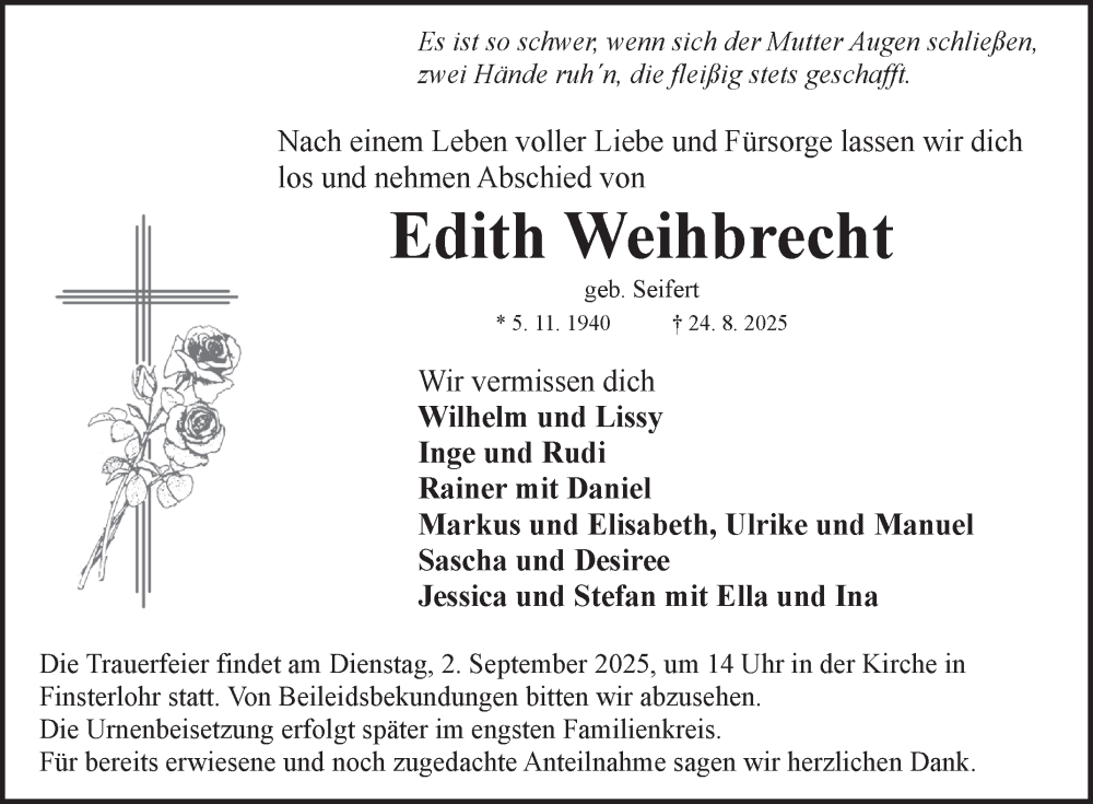 Hier finden Sie alle Traueranzeigen aus der Zeitung, die bisher für Edith Weihbrecht erschienen sind. Weitere Traueranzeigen, die in der Zeitung erscheinen, werden hier ebenfalls aufgelistet