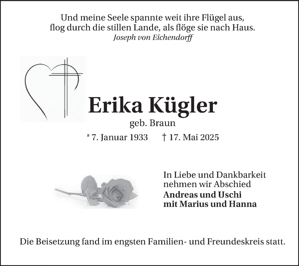 Hier finden Sie alle Traueranzeigen aus der Zeitung, die bisher für Erika Kügler erschienen sind. Weitere Traueranzeigen, die in der Zeitung erscheinen, werden hier ebenfalls aufgelistet