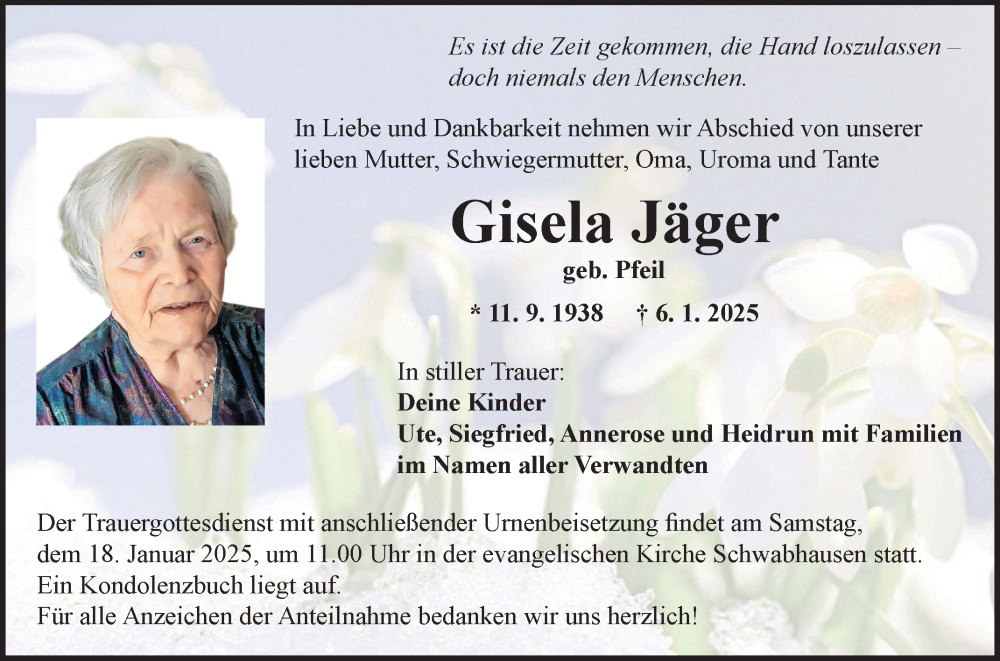Hier finden Sie alle Traueranzeigen aus der Zeitung, die bisher für Gisela Jäger erschienen sind. Weitere Traueranzeigen, die in der Zeitung erscheinen, werden hier ebenfalls aufgelistet