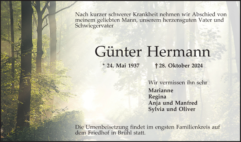 Hier finden Sie alle Traueranzeigen aus der Zeitung, die bisher für Günter Hermann erschienen sind. Weitere Traueranzeigen, die in der Zeitung erscheinen, werden hier ebenfalls aufgelistet