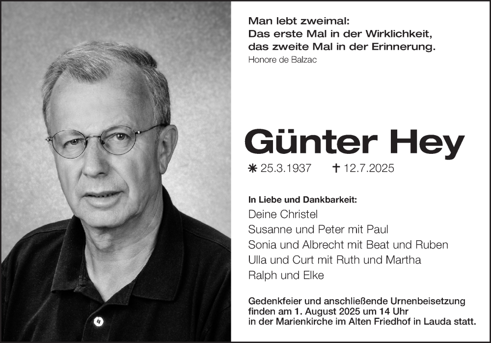 Hier finden Sie alle Traueranzeigen aus der Zeitung, die bisher für Günter Hey erschienen sind. Weitere Traueranzeigen, die in der Zeitung erscheinen, werden hier ebenfalls aufgelistet