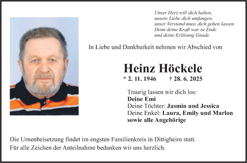 Hier finden Sie alle Traueranzeigen aus der Zeitung, die bisher für Heinz Höckele erschienen sind. Weitere Traueranzeigen, die in der Zeitung erscheinen, werden hier ebenfalls aufgelistet