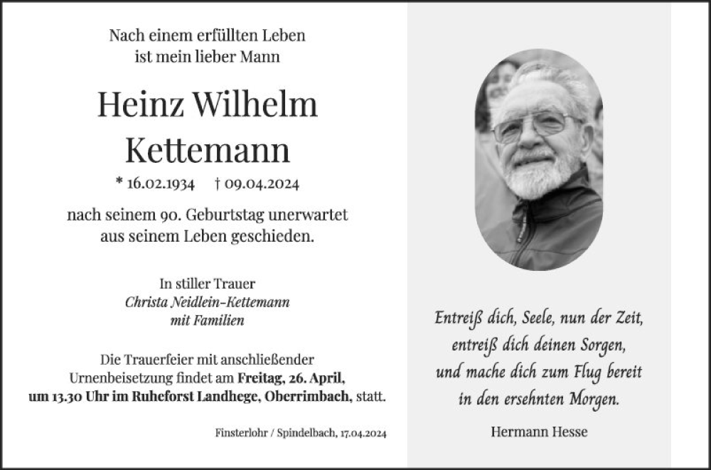 Hier finden Sie alle Traueranzeigen aus der Zeitung, die bisher für Heinz Wilhelm Kettemann erschienen sind. Weitere Traueranzeigen, die in der Zeitung erscheinen, werden hier ebenfalls aufgelistet