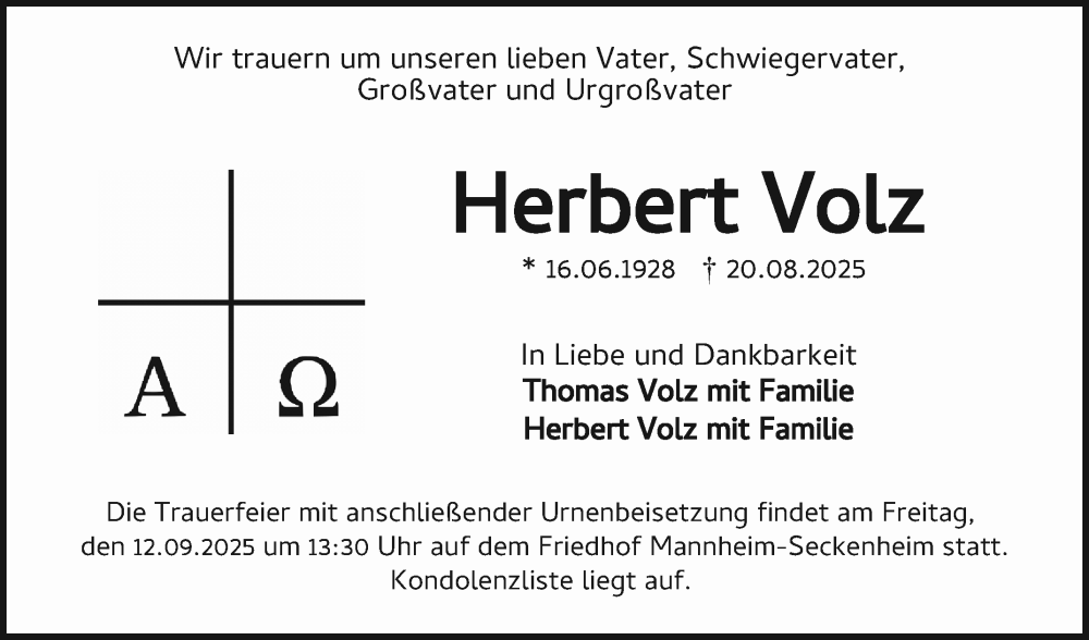 Hier finden Sie alle Traueranzeigen aus der Zeitung, die bisher für Herbert Volz erschienen sind. Weitere Traueranzeigen, die in der Zeitung erscheinen, werden hier ebenfalls aufgelistet
