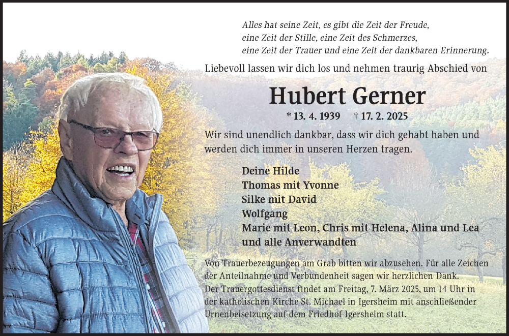 Hier finden Sie alle Traueranzeigen aus der Zeitung, die bisher für Hubert Gerner erschienen sind. Weitere Traueranzeigen, die in der Zeitung erscheinen, werden hier ebenfalls aufgelistet