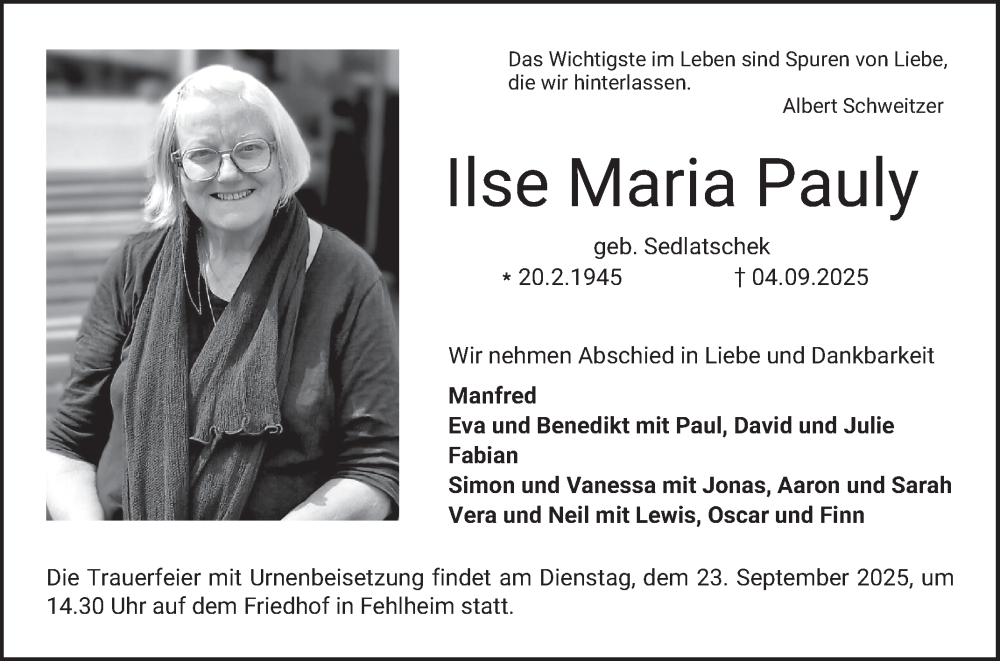 Hier finden Sie alle Traueranzeigen aus der Zeitung, die bisher für Ilse Maria Pauly erschienen sind. Weitere Traueranzeigen, die in der Zeitung erscheinen, werden hier ebenfalls aufgelistet