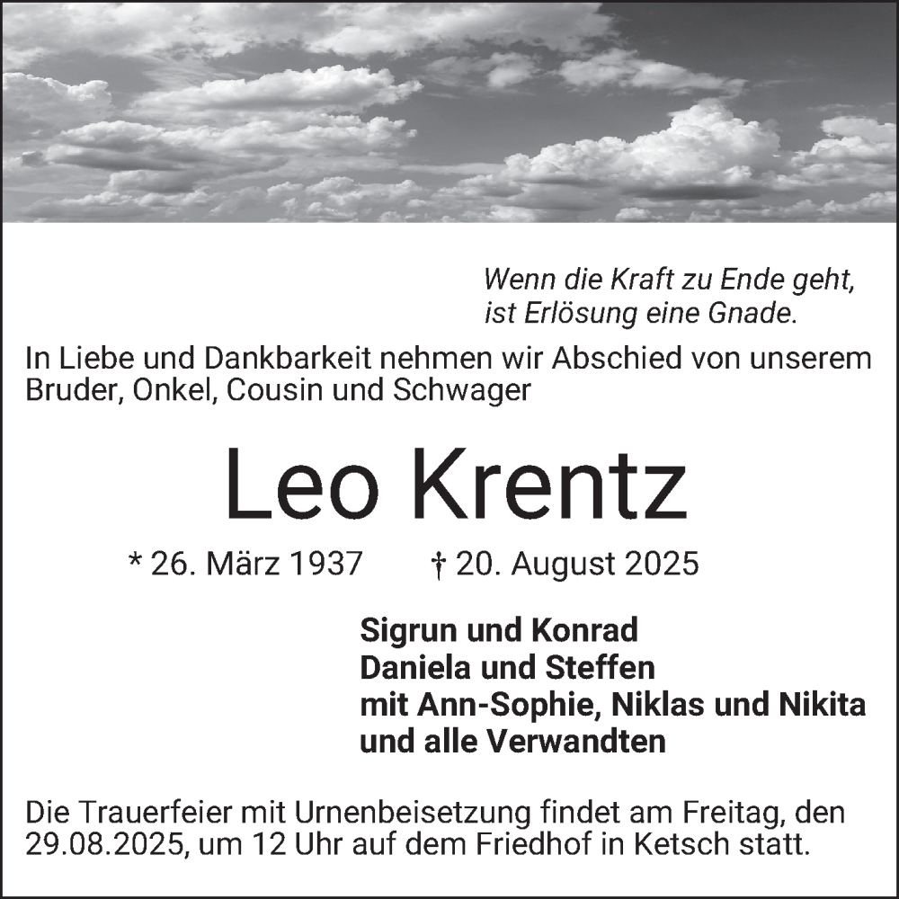 Hier finden Sie alle Traueranzeigen aus der Zeitung, die bisher für Leo Krentz erschienen sind. Weitere Traueranzeigen, die in der Zeitung erscheinen, werden hier ebenfalls aufgelistet