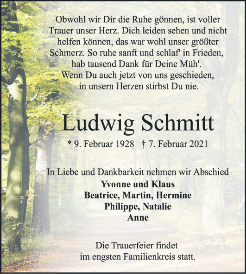 Hier finden Sie alle Traueranzeigen aus der Zeitung, die bisher für Ludwig Schmitt erschienen sind. Weitere Traueranzeigen, die in der Zeitung erscheinen, werden hier ebenfalls aufgelistet