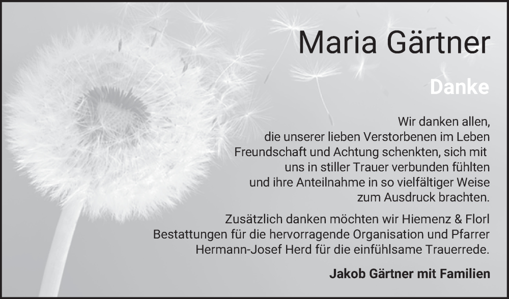 Hier finden Sie alle Traueranzeigen aus der Zeitung, die bisher für Maria Gärtner erschienen sind. Weitere Traueranzeigen, die in der Zeitung erscheinen, werden hier ebenfalls aufgelistet