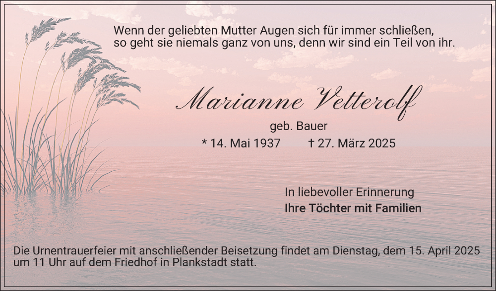 Hier finden Sie alle Traueranzeigen aus der Zeitung, die bisher für Marianne Vetterolf erschienen sind. Weitere Traueranzeigen, die in der Zeitung erscheinen, werden hier ebenfalls aufgelistet