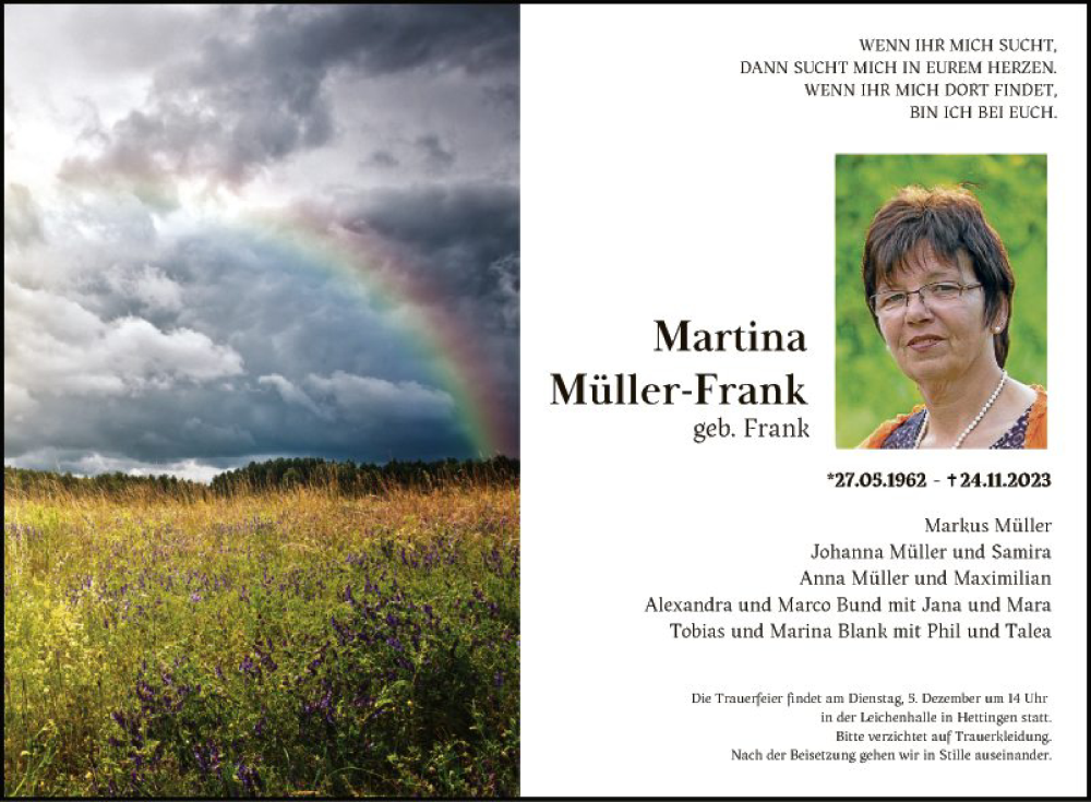Hier finden Sie alle Traueranzeigen aus der Zeitung, die bisher für Martina Müller-Frank erschienen sind. Weitere Traueranzeigen, die in der Zeitung erscheinen, werden hier ebenfalls aufgelistet