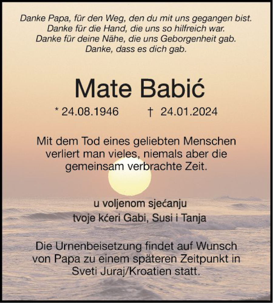 Hier finden Sie alle Traueranzeigen aus der Zeitung, die bisher für Mate Babic erschienen sind. Weitere Traueranzeigen, die in der Zeitung erscheinen, werden hier ebenfalls aufgelistet