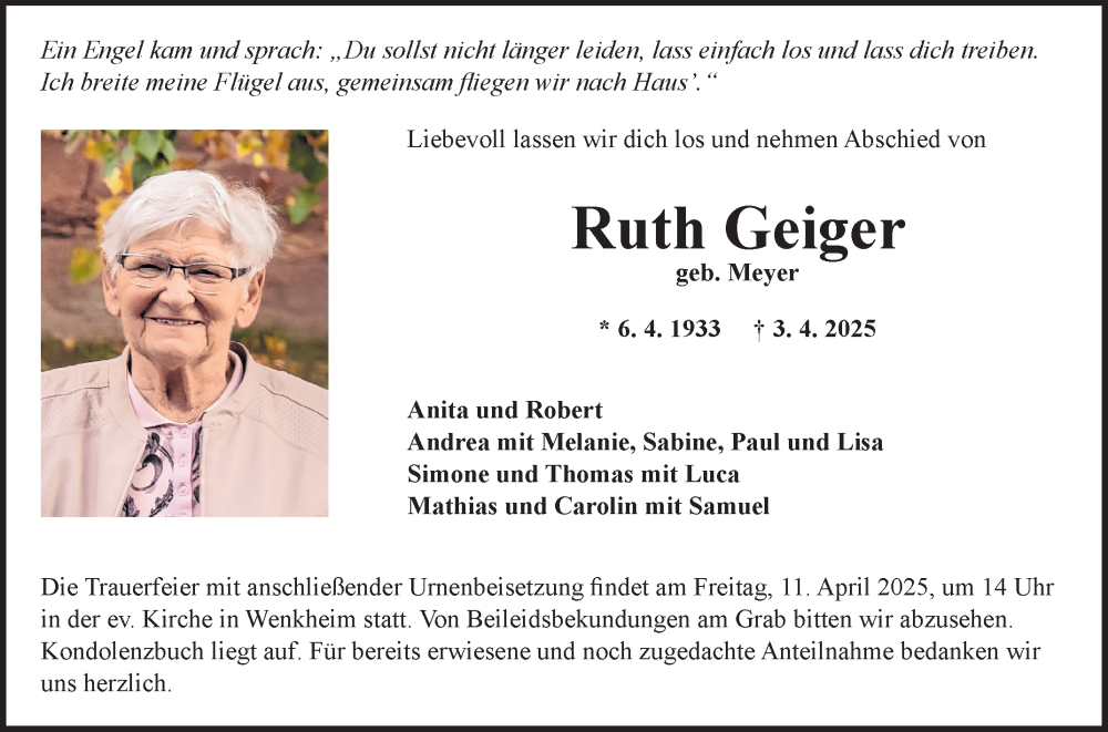 Hier finden Sie alle Traueranzeigen aus der Zeitung, die bisher für Ruth Geiger erschienen sind. Weitere Traueranzeigen, die in der Zeitung erscheinen, werden hier ebenfalls aufgelistet