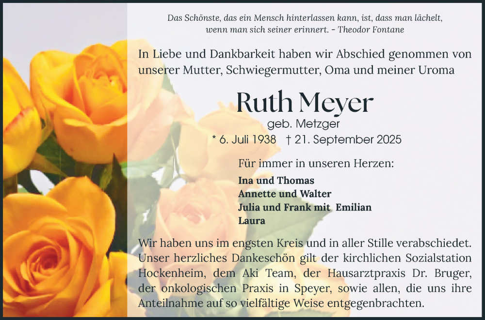 Hier finden Sie alle Traueranzeigen aus der Zeitung, die bisher für Ruth Meyer erschienen sind. Weitere Traueranzeigen, die in der Zeitung erscheinen, werden hier ebenfalls aufgelistet