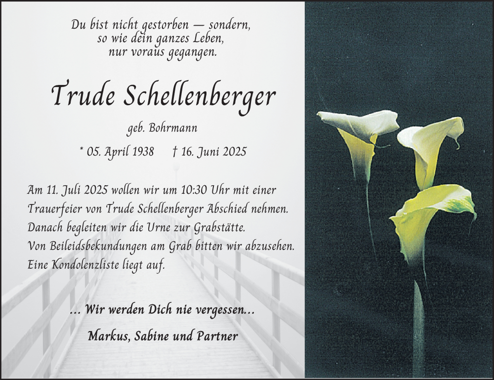 Hier finden Sie alle Traueranzeigen aus der Zeitung, die bisher für Trude Schellenberger erschienen sind. Weitere Traueranzeigen, die in der Zeitung erscheinen, werden hier ebenfalls aufgelistet