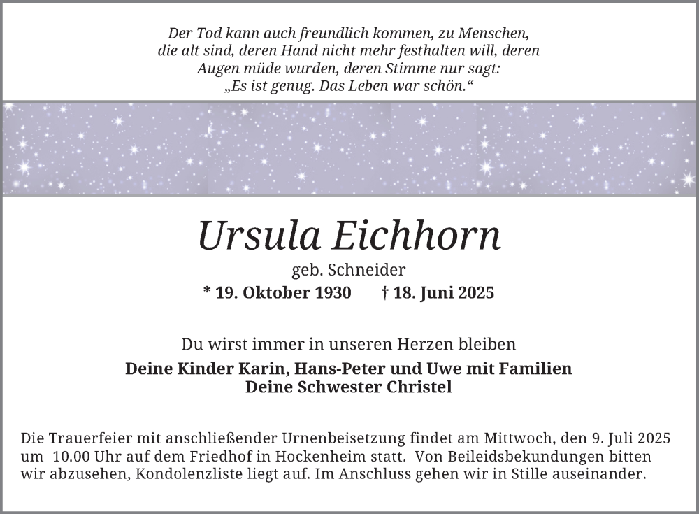 Hier finden Sie alle Traueranzeigen aus der Zeitung, die bisher für Ursula Eichhorn erschienen sind. Weitere Traueranzeigen, die in der Zeitung erscheinen, werden hier ebenfalls aufgelistet