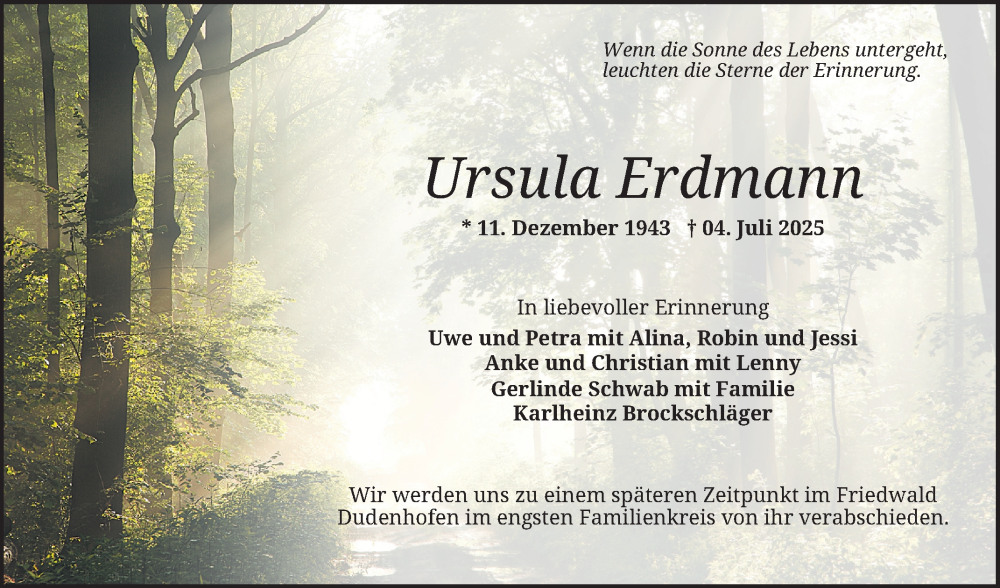 Hier finden Sie alle Traueranzeigen aus der Zeitung, die bisher für Ursula Erdmann erschienen sind. Weitere Traueranzeigen, die in der Zeitung erscheinen, werden hier ebenfalls aufgelistet