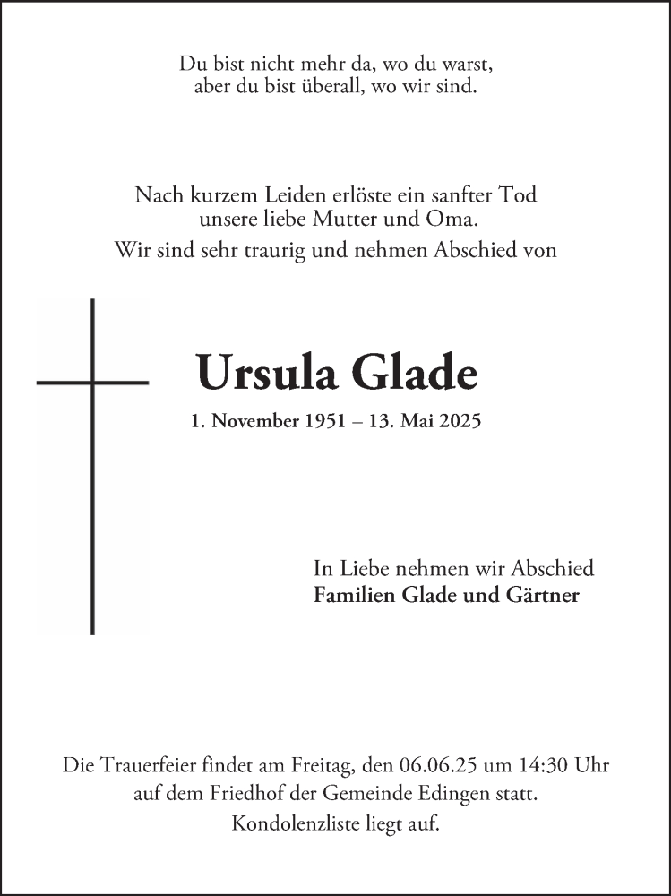 Hier finden Sie alle Traueranzeigen aus der Zeitung, die bisher für Ursula Glade erschienen sind. Weitere Traueranzeigen, die in der Zeitung erscheinen, werden hier ebenfalls aufgelistet