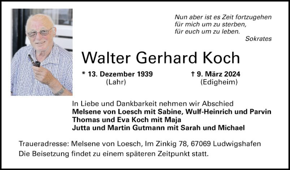 Hier finden Sie alle Traueranzeigen aus der Zeitung, die bisher für Walter Gerhard Koch erschienen sind. Weitere Traueranzeigen, die in der Zeitung erscheinen, werden hier ebenfalls aufgelistet