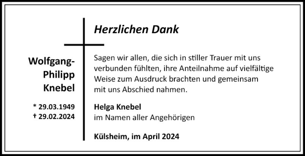 Hier finden Sie alle Traueranzeigen aus der Zeitung, die bisher für Wolfgang-Philipp Knebel erschienen sind. Weitere Traueranzeigen, die in der Zeitung erscheinen, werden hier ebenfalls aufgelistet